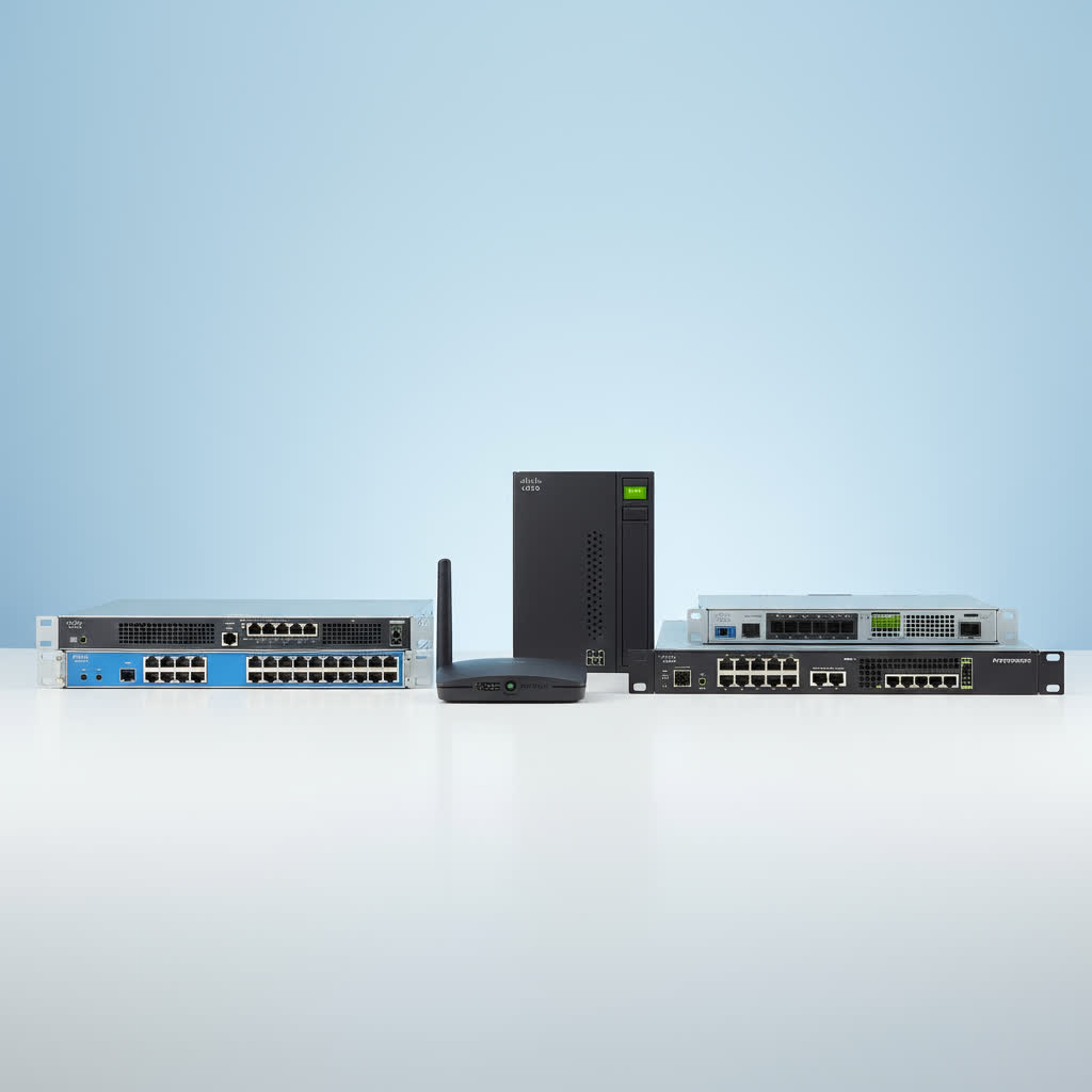 Consolida tu red con equipos Cisco: switches Catalyst/Meraki con PoE/Stacking/VLAN, routers ISR/SD-WAN, firewalls Firepower y AP Wi-Fi 6/6E con gestión en la nube.