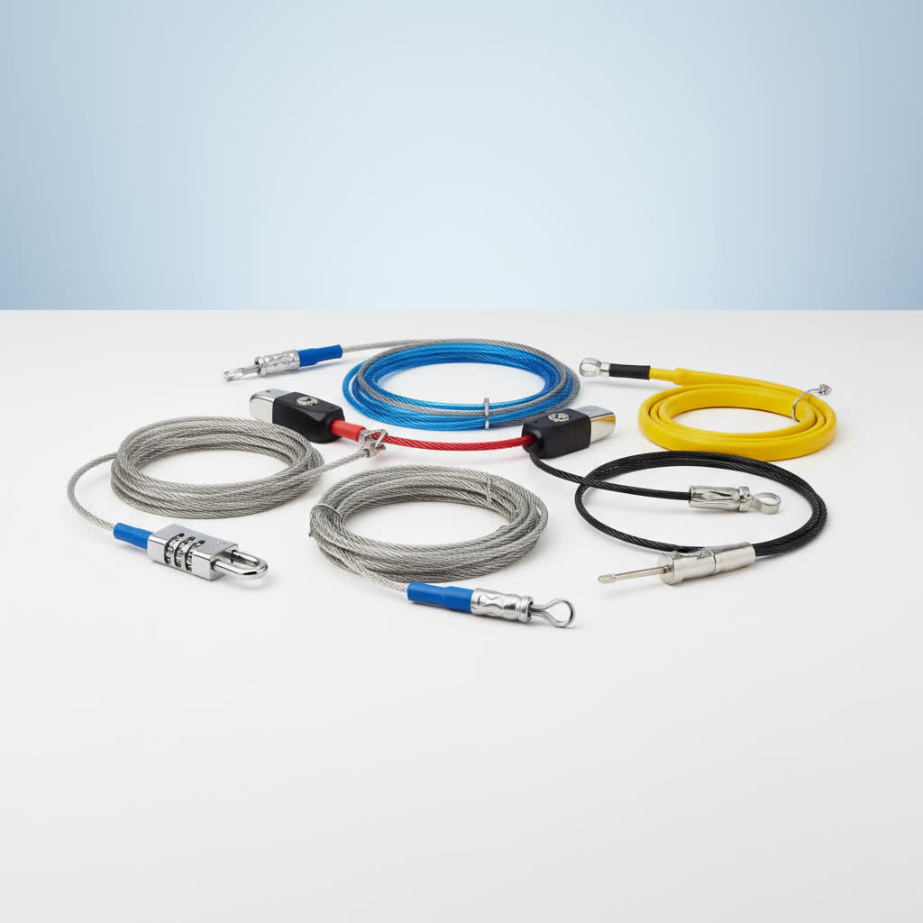 Protege laptops, monitores y docks con guayas de seguridad en acero trenzado y sistemas K-Slot, Noble y Nano.