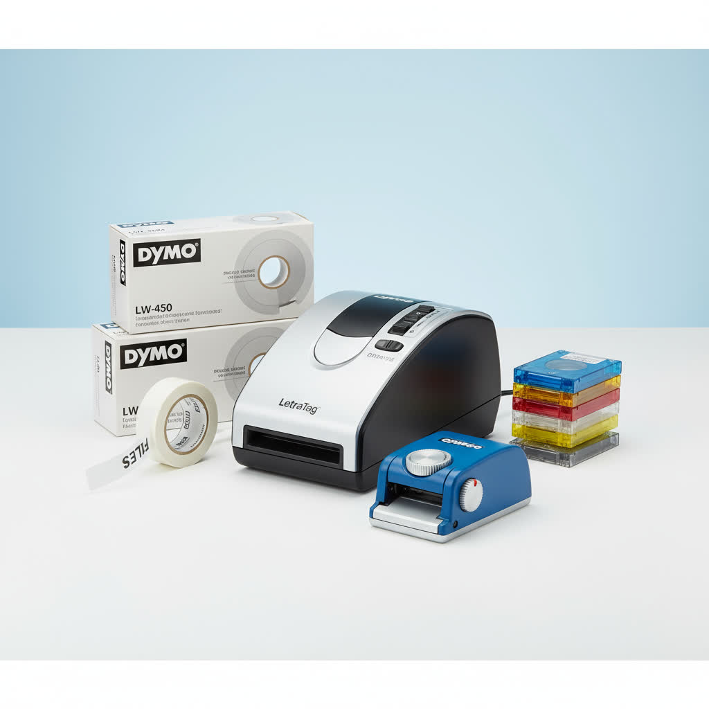 Etiqueta sin errores con suministros Dymo originales: LabelWriter (incl. 4XL para envíos), cintas D1 y LetraTag en varios anchos y colores.